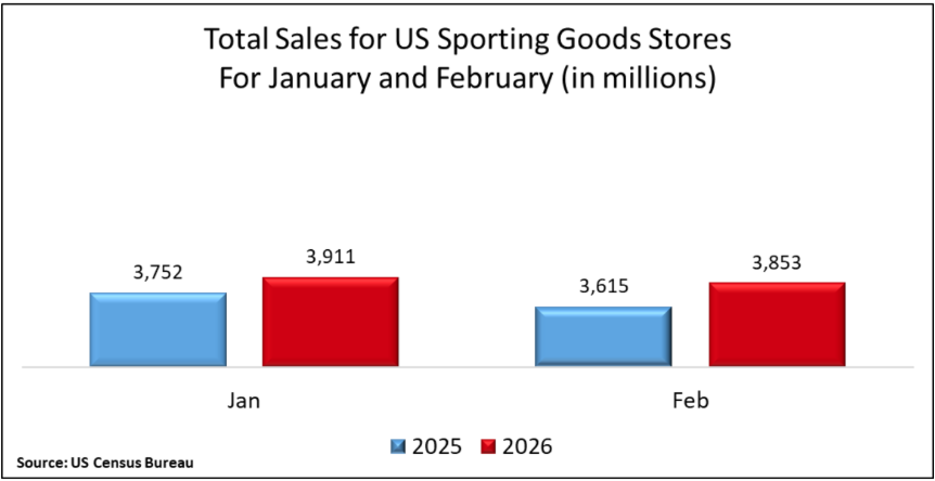 DOWNERS GROVE, ILLINOIS (April 27, 2026) – According to the US Census Bureau’s Monthly Retail Trade Report, sales for sporting goods stores during the month of February reached $3.85 billion, representing an increase of 6.6 percent compared to the prior year. Thus far in 2026, YTD sales are up 5.4 percent vs. 2025.